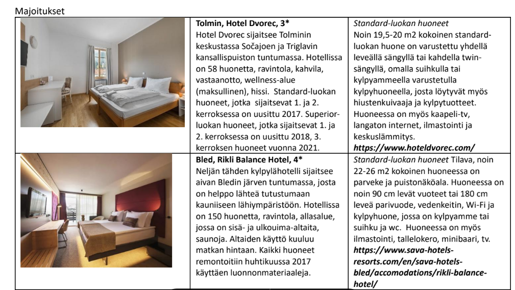 korotus superior-luokaan 2 hengen huoneessa, 108 euroa / huone /oleskelu; illallislisä Tolmin 25 eur / hlö / vrk