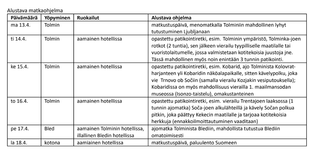 €/hlö/koko matka), pysäköintimaksut, ruokajuomat illallisen yhteydessä Bledissä, muut mainitsemattomat ruokailut ja